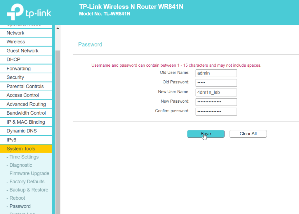 El último paso que realizaremos será el de cambiar esta contraseña (algunos routers permiten incluso cambiar el usuario). En nuestro caso, esto estará en el apartado «System tools» en el subapartado «Password»: