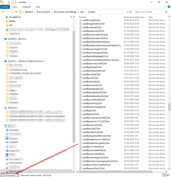 Por hacer un poco de forénsica de andar por casa con un mínimo de ética, indagué en las cookies. Ví que la familia (identifiqué al menos 4 usuarios a los que vamos a llamar “los López”) usaba el PC con un único usuario, además de Windows XP. Como véis, un auténtico fortín, aunque es de esperar ya que supongo que es el motivo de que lo desecharan, un equipo obsoleto, aunque en este caso averiado, es lógico que no cuente con el último software. Pues ni más ni menos que 825 cookies….